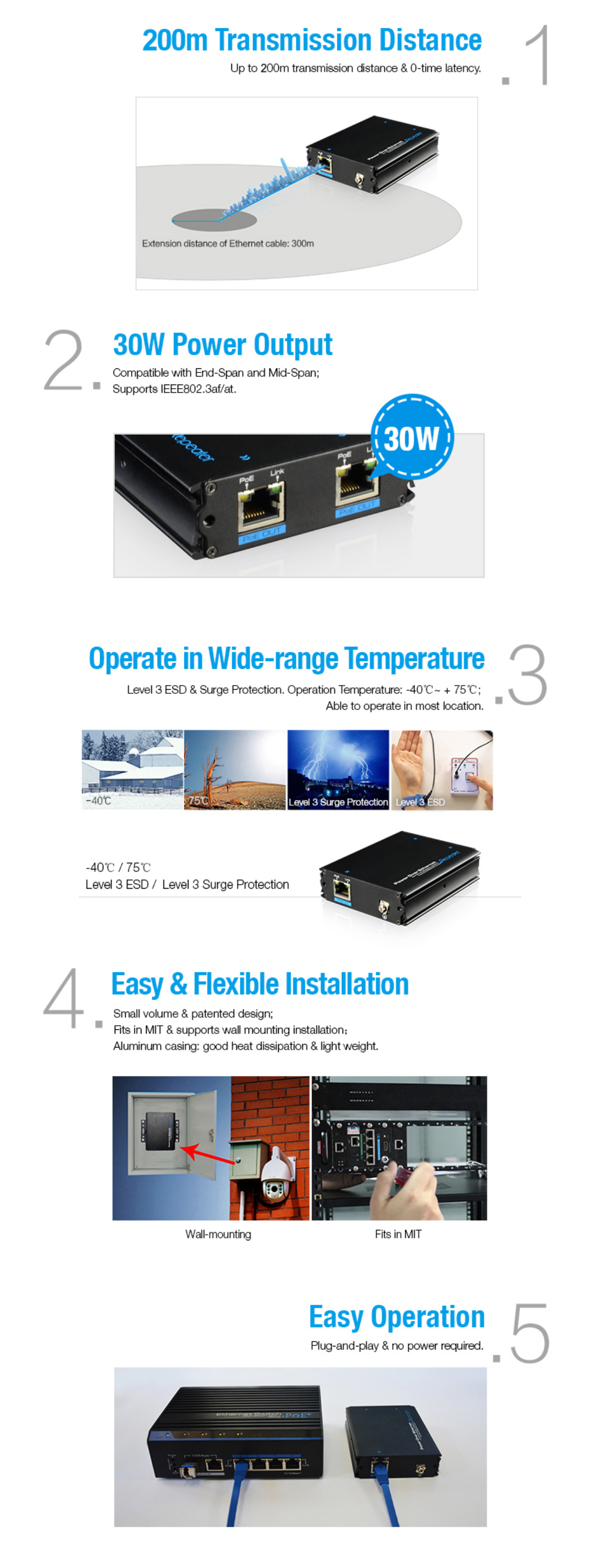 PoE Power Supply,POE input (IEEE 802.3af/at),DC48V-57V, 30W max. |
